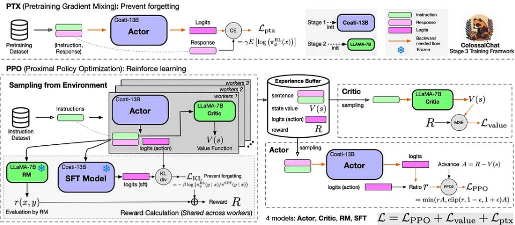 ColossalChat includes the RLHF process that aims to replicate ChatGPT-like models. ColossalChat RLHF pipeline involves three stages: supervised instruct fine-tuning, training a reward model, and optimizing with reinforcement learning.
