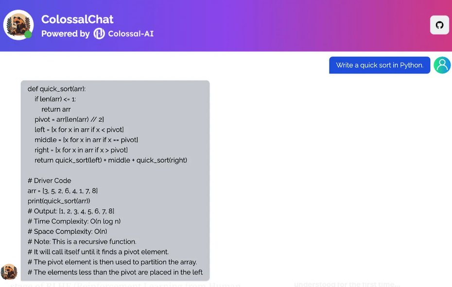 ColossalChat requires less than 10B parameters and can attain bilingual proficiency in English & Chinese through RLHF finetuning. Achieves comparable results to ChatGPT and GPT-3.5. The examples showcase email writing and code generation capabilities. https://t.co/iMap9TMDIi