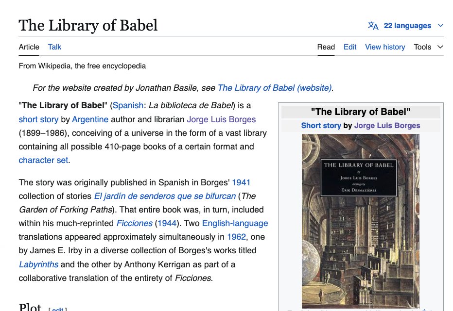 View TweetThe Borges story âLibrary of Babelâ is about taking sloppification to the absolute limit. Literally every single sequence of characters that can be generated, is. The whole world becomes that. It tries to figure out what happens to religion and meaning in the resulting world.